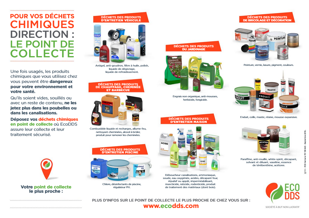 Parce que les produits chimiques usagés peuvent constituer des déchets dangereux pour votre santé et celle des agents de collecte, mais aussi pour votre environnement en tant que facteur de pollution important, ils ne peuvent être pris en charge par le service de collecte et ne doivent être jetés ni dans les poubelles (car vous empêchez alors leur valorisation) ni dans les canalisations (car ils sont mal éliminés lors des traitements des stations d’épuration et rejoignent le milieu naturel avec un effet très néfaste sur la plupart des espèces vivantes).