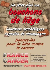 On pousse le bouchon un peu plus loin aussi en Pays d’Apt. Depuis plusieurs années, la cave Sylla organise la collecte des bouchons en liège, des bouchons synthétiques et des capsules de champagne. Cette collecte sert à financer la recherche contre le cancer. En effet, une fois remis à l’association France Cancer, ces bouchons sont revendus à des entreprises de recyclage, distinctes selon qu’il s’agit de bouchons en liège ou de bouchons synthétiques. Les premiers deviennent des panneaux d’isolation phonique et thermique, des revêtements de sols et de murs, du mobilier, du matériel d’hôtellerie, des semelles de chaussures, et bien d’autres choses encore. Les synthétiques deviendront des serre-masques, des jardinières, des seaux à champagne, du mobilier, par exemple.