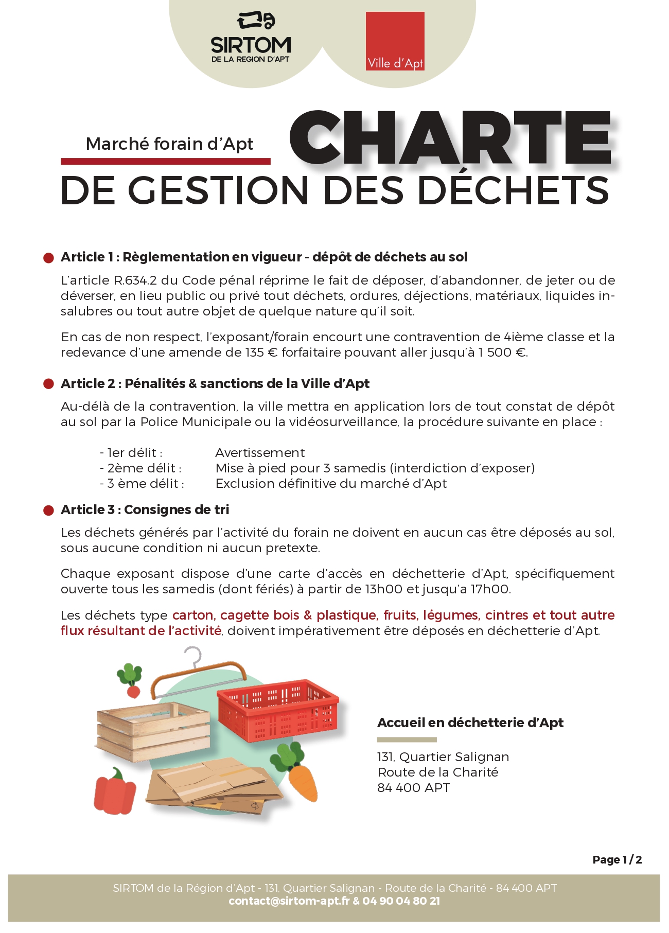 Il est donc formellement interdit aux commerçants non sédentaires de déposer leurs déchets dans les bacs présents sur la voie publique, l’utilisation de ces bacs et a fortiori leur déplacement jusqu’à un stand étant strictement prohibés pour tout dépôt résultant d’une activité professionnelle. Il leur incombe de les amener en déchetterie, où un accès spécifique leur est accordé le samedi entre 13h et 17h grâce à une carte dédiée. Les déchets de type carton, cagettes bois et plastique, fruits, légumes, cintres et tout autre flux résultant d’une activité sur le marché doivent impérativement être déposés en déchetterie d’Apt.