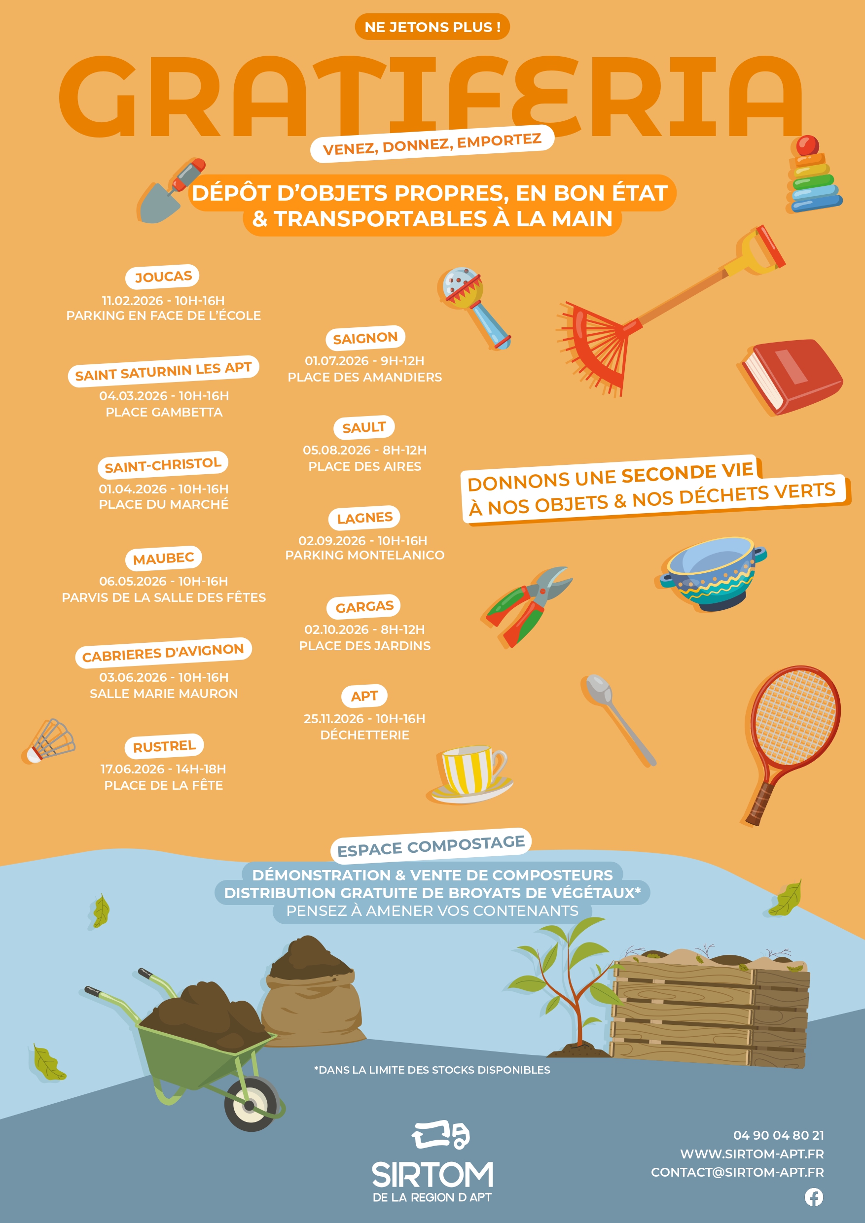 Dans le cadre de sa politique de réduction des déchets, le Sirtom s’engage à nouveau en 2026 avec de nouvelles gratiferias tout au long de l’année 2026, une fois par mois (la première ayant eu lieu en février).