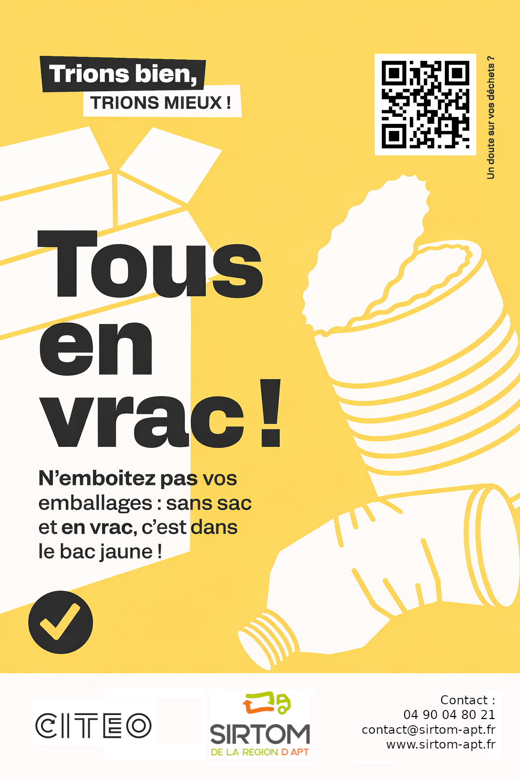 – les sacs noirs constituent la principale erreur détectée dans les bacs jaunes. Il est donc essentiel que soit bien comprise la règle suivante : des emballages placés dans un sac noir seront nécessairement considérés en bout de course comme des refus. Lorsque ces sacs parviennent au centre de tri, les agents n’ont pas le temps d’ouvrir, sur le tapis qui défile devant eux, les sacs noirs, d’ailleurs susceptibles de contenir des objets dangereux, blessants/coupants, pour en examiner le contenu. Il ne faut pas insérer un emballage à l’intérieur d’un autre avant de les jeter dans le bac de recyclage. Le traitement des emballages imbriqués coûte 10 fois plus cher que le traitement d’emballages mis en vrac. Après avoir été considérés comme des refus, ils doivent être détournés vers l’usine d’incinération où ils seront brûlés. Alors n’oublions pas les règles principales s’appliquant au bac jaune : ne pas emboîter les emballages ; déposer les emballages sans sac et en vrac ; inutile de les laver, il suffit de bien les vider.