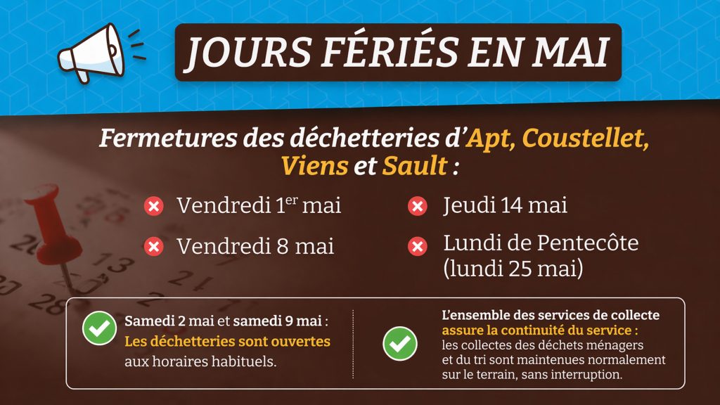 À ces dates uniquement, les déchetteries d’Apt, Coustellet, Viens et Sault sont fermées. En dehors de ces jours fériés, elles restent ouvertes aux horaires habituels.